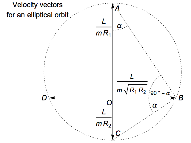 The radius of the velocity circle, which we found previously to be L (R1 + R2) / (2 m R1 R2), can be expressed in terms of the force constant and the angular momentum: