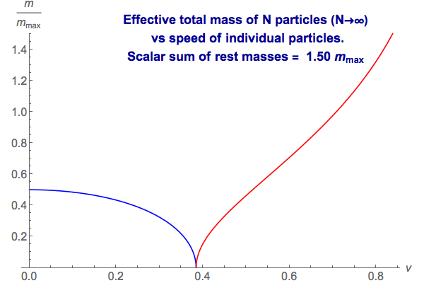 It turns out that, for large N, the total holonomy of such systems depends on v and on the scalar sum of the particles’ rest mass, M. In other words, if we have N individual particles each of rest mass M/N and speed v, then as N gets larger the total holonomy converges on a fixed function of M and v.