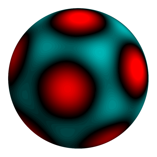 It turns out that the first few values of ℓ for which Mℓ is non-zero are 0, 6, 10 and 15. The first case, ℓ=0, is trivial: it gives a constant function on the sphere, which is certainly unchanged by any of the rotations in I, but is rather boring. The other three cases, ℓ=6, 10 and 15, are shown in the images on the left. Here the brightness of each point indicates the magnitude of the function, while the two colours (which are chosen arbitrarily) indicate positive and negative values. Although the individual spherical harmonics, Yℓ,m, are generally complex-valued, these symmetric combinations of them always turn out to be real-valued (or, depending on what conventions are adopted, to have a single complex phase as an overall factor, which can be divided out without changing the symmetries of the function). In all of these images, the rotation is meant as a rotation of the point of view, in order to show more of the function; it is not meant to imply that the wave function itself is physically rotating with the passage of time.